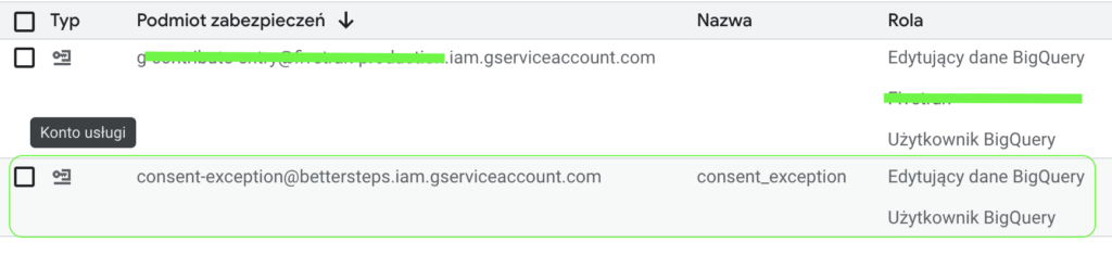 To najprostszy punkt całej zabawy - tworzymy zwykłe konto serwisowe i nadajemy mu uprawnienia Edytującego Dane Big Query - jest to konieczne, żeby konto w naszym imieniu mogło zapisywać dane do tabeli.