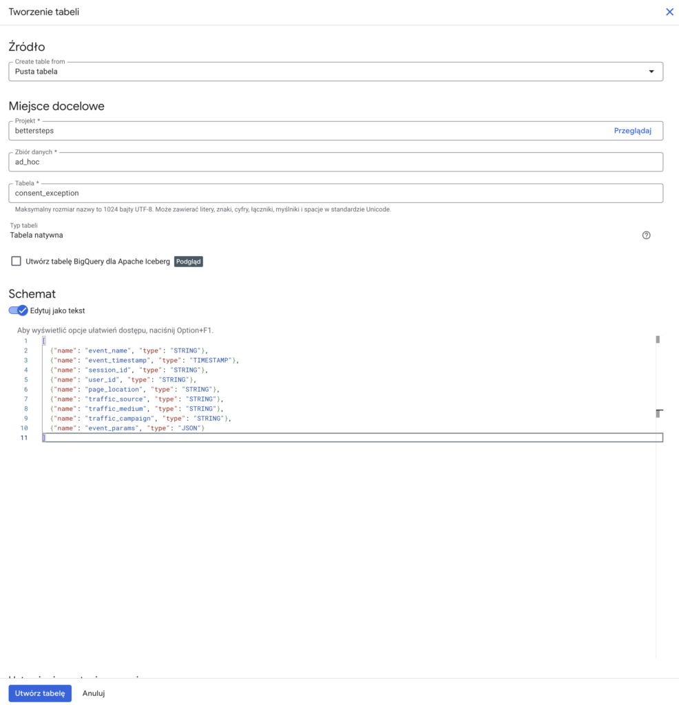 - Dedykowaną tabelę w BQ o odpowiednim schemacie