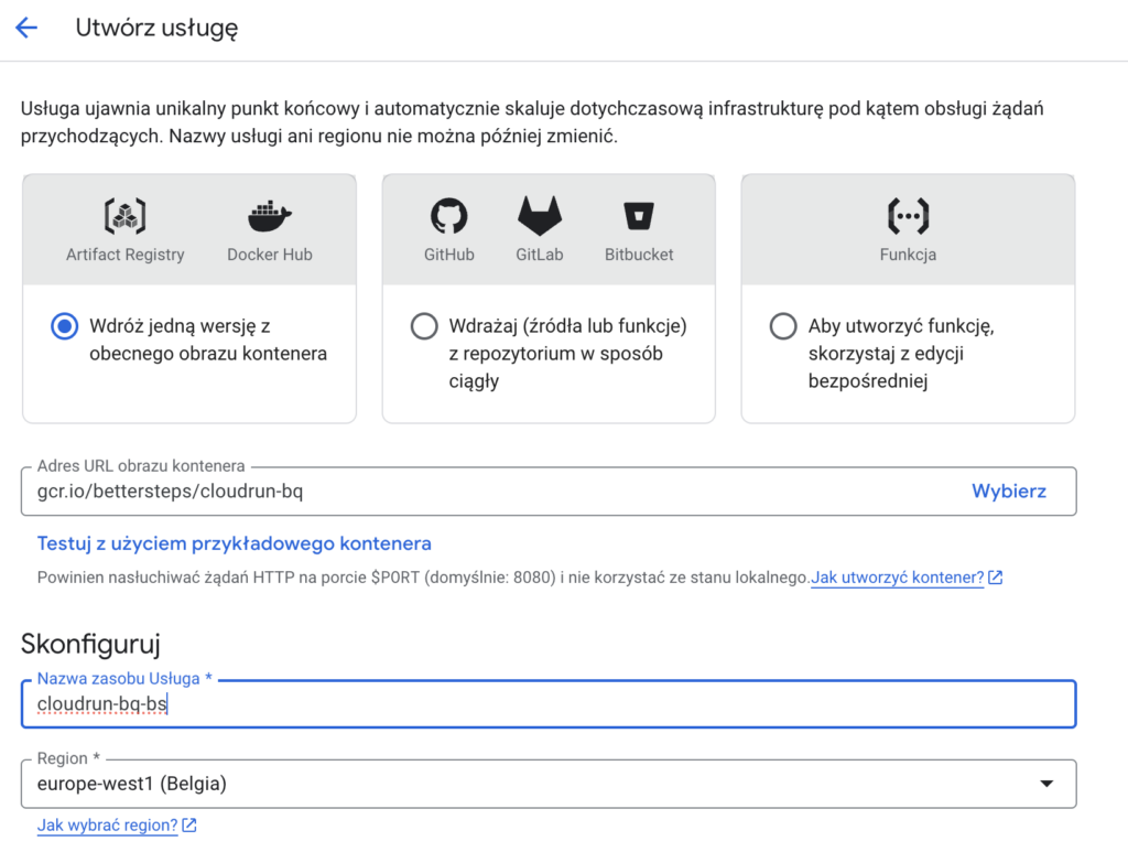 gcr.io/bettersteps/cloudrun-bqW polu Nazwa zasobu Usługa podaj dowolną nazwę swojego kontenera