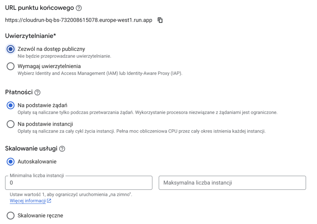 Po zakończeniu deploy’u Cloud Run wyświetli URL serwisu.