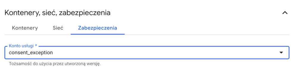 Ostatnim elementem do zmiany jest wybór konta serwisowego w sekcji zabezpieczenia na to, które utworzyliśmy wcześniej i które ma dostęp do BQ - to on będzie tam zapisywać dane.