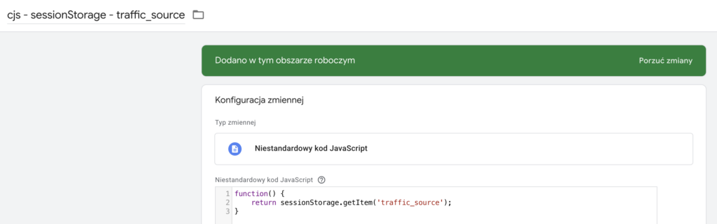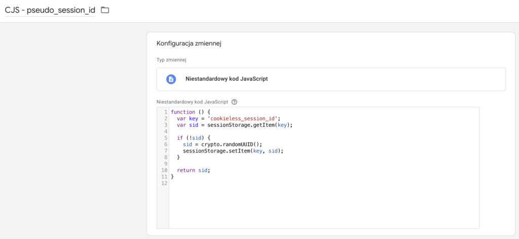 W naszym kontenerze GTM musimy utworzyć odpowiednią zmienną niestandardową, która utworzy taki unikalny identyfikator i zapisze go w session storage, żeby po zamknięciu przeglądarki wygasł.