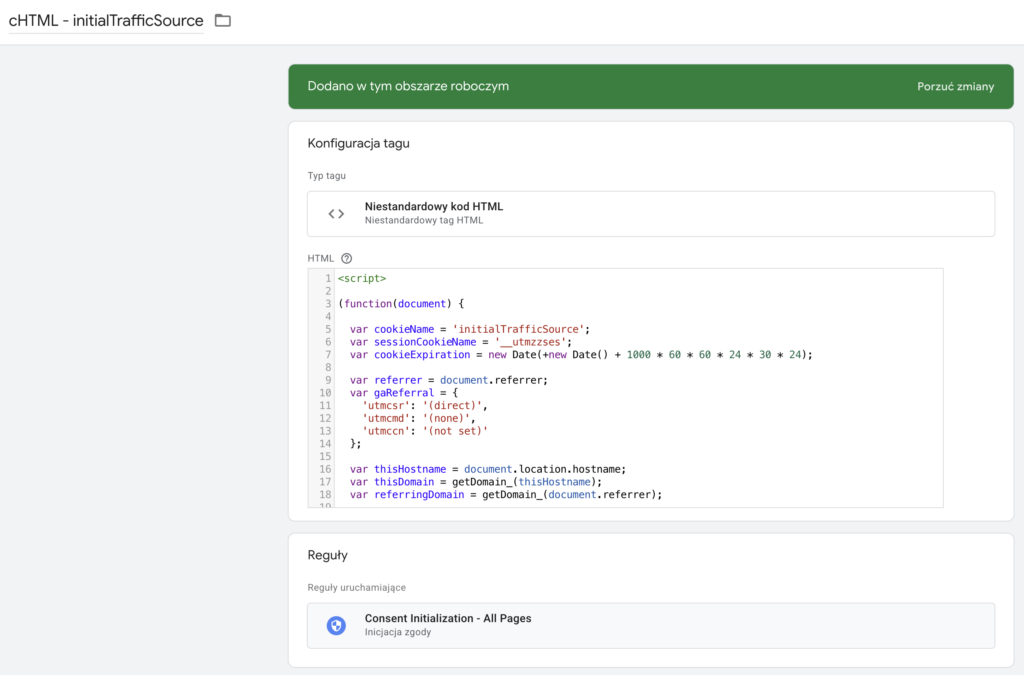 W pliku JSON dla webowego kontenra GTM dołączonego do tego materiału znajdziesz niestandardowy tag HTML z kodem przechwytującym źródła ruchu w obrębie sesji i zapisującym ich wartość do session storage podobnie jak w przypadku pseudo session id.
