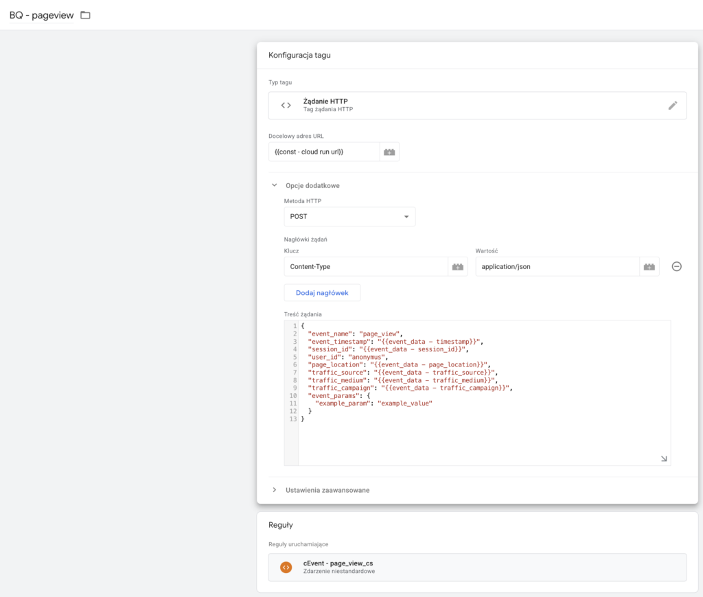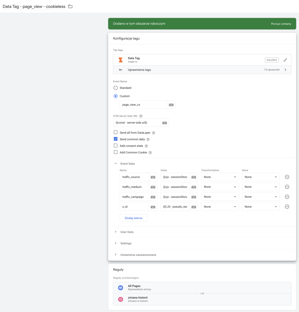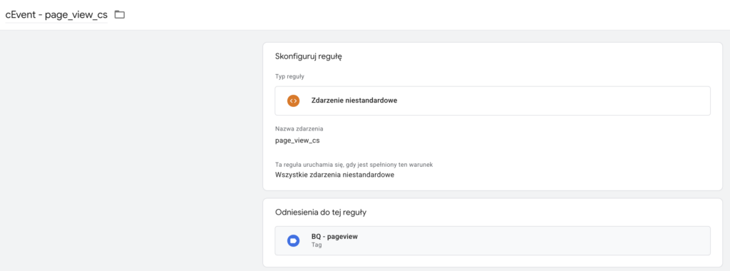 Do tagu dodałem reguły uruchamiające się przy odsłonie nowej strony i w ten sposób skonfigurowałem wysyłanie informacji o wyświetleniach do mojego serwera tagowania.