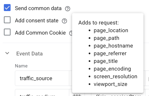 Zaznaczam checkbox Send common data, żeby odebrać standardowe parametry adresu url: