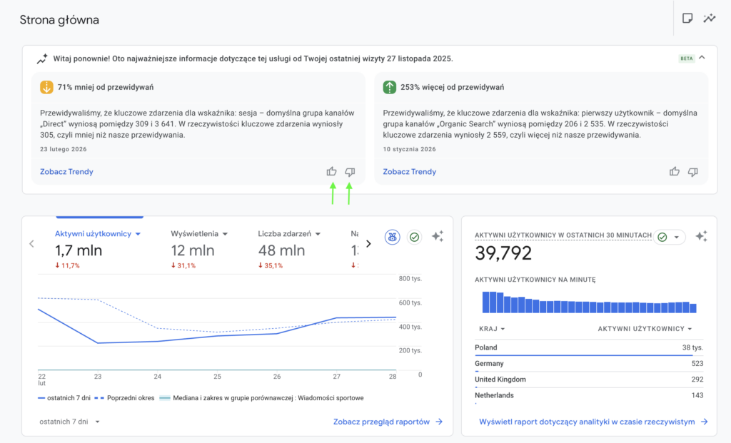W lutym mamy niestety tylko jedną aktualizacje. Jest to generowanie wniosków/spostrzeżeń za pomocą AI na podstawie danych zebranych przez GA od naszej ostatniej wizyty.