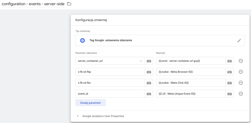 Konfiguracja zdarzeń GA4 server - zmienna konfiguracji zdarzeń GA4 dla łatwego zarządzania zmianami tagowania w przyszłości.