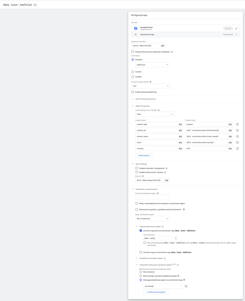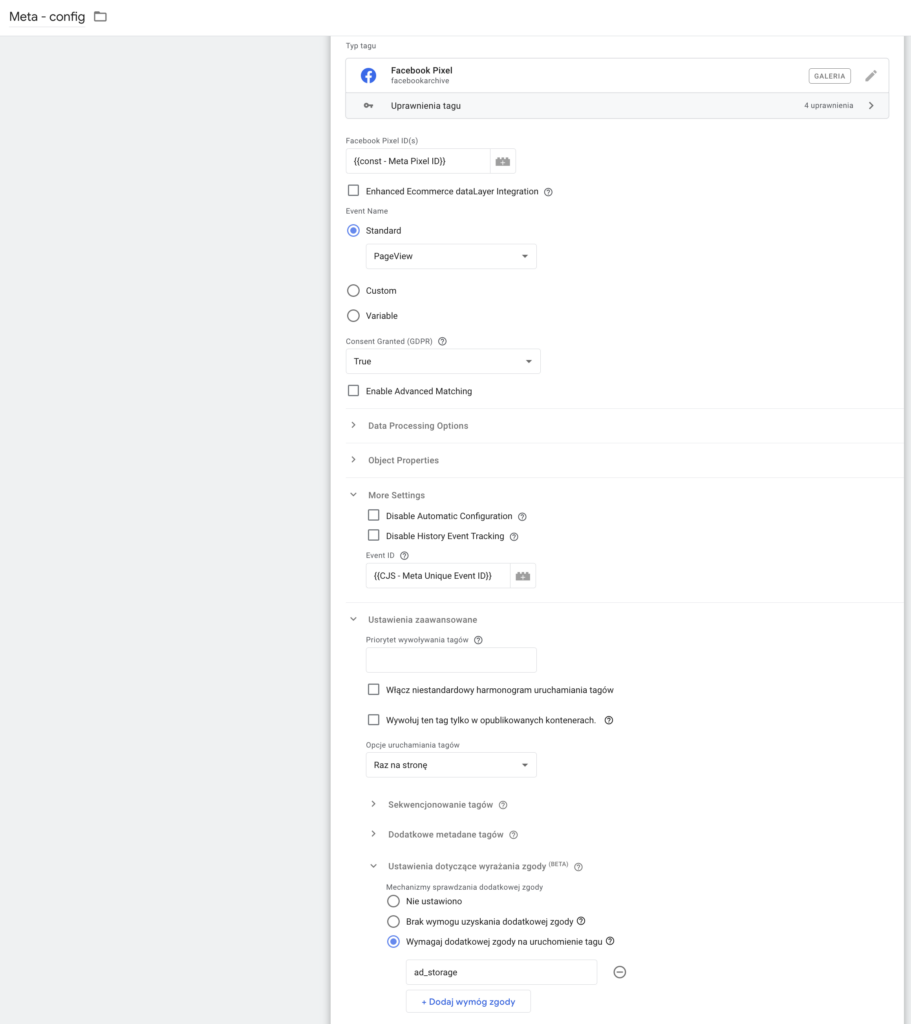 Musimy pamiętać o ustawieniu uruchamiania tagu raz na stronę oraz o ustawieniu wymaganych zgód, ale o tą kwestię rozwiniemy w dedykowanej sekcji.