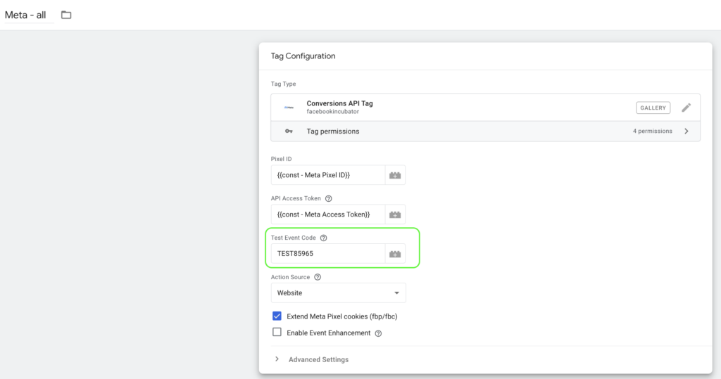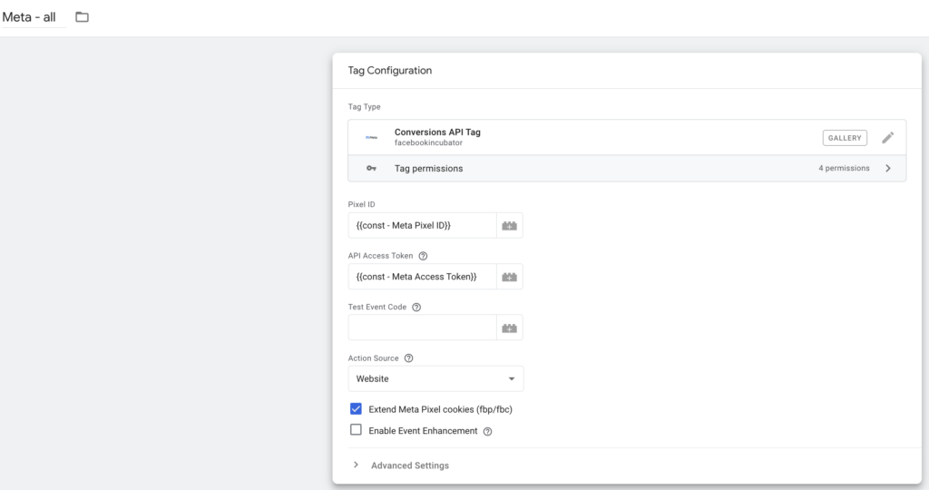 Aby wysłać odebrane przez serwer tagowania dane do naszego konta w Mecie skorzystamy z tagu Conversion API Tag od facebookincubator.