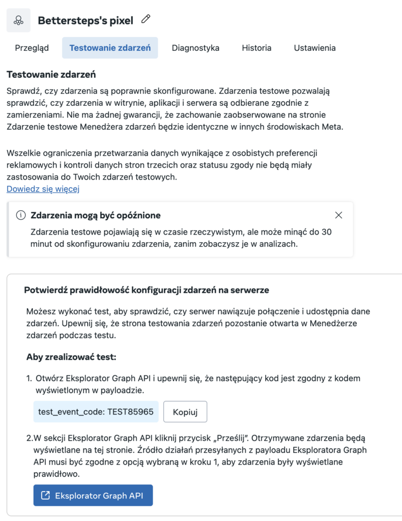 Skoro nasz pixel Meta odbiera już prawidłowo dane ze strony ze wszystkimi parametrami potrzebnymi do deduplikacji danych odebranych przez CAPI możemy przystąpić do właściwej części konfiguracji.