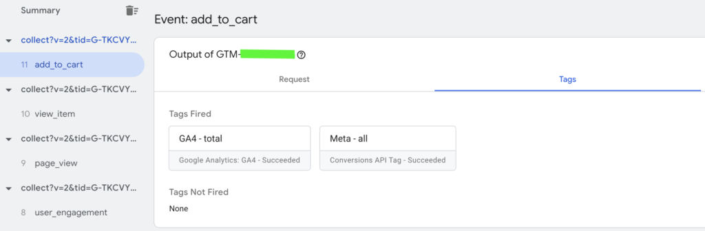 Oczekujemy, że w tym samym momencie uruchomi się zarówno tag pixela jak i tag zdarzenia GA4, który wysyła dane do serwera.