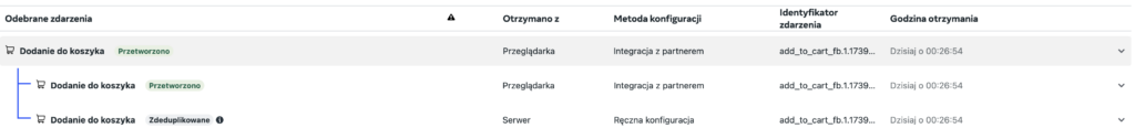 Na sam koniec powinnismy sprawdzić zdarzenie w menadżerze zdarzeń Meta. Dzięki temu możemy potwierdzić, czy odbieranie i deduplikacja zdarzeń działa prawidłowo.