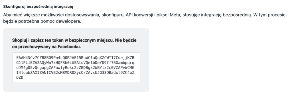 Należy wejść w źródła danych - > pixel - > ustawienia, a nastepnie kliknąć przycisk Wygeneruj token dostępu.