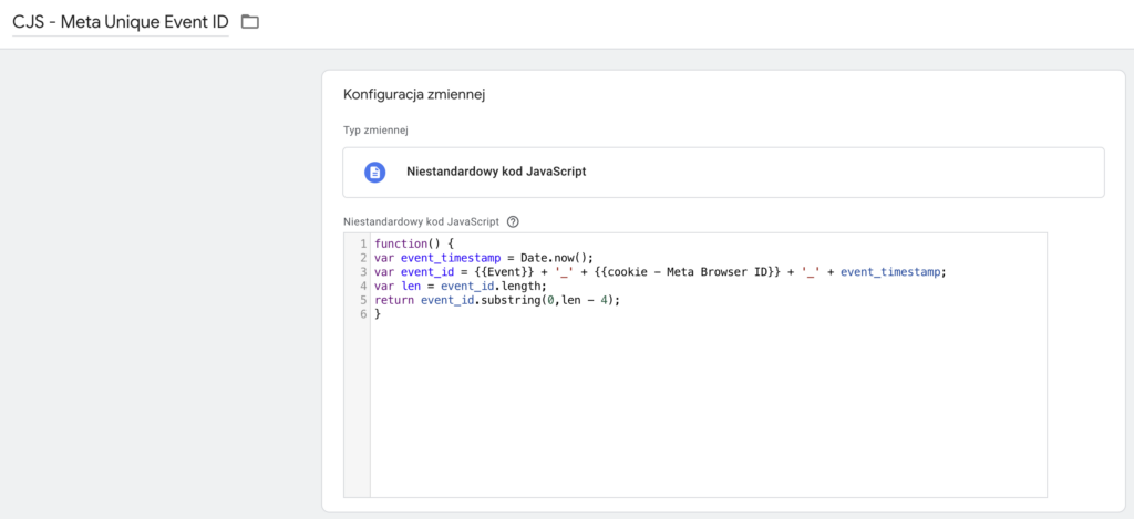 Zmienna to to moja autorska twórczość. Składa się ona z połączenia nazwy eventu, identyfikatora ciasteczka Mety oraz timestamp’u zdarzenia pomniejszonego o ostatnie cztery cyfry - jest to bardzo kluczowy zabieg, gdyż aby deduplikacja działała prawidłowo wartość tej zmiennej musi być identyczna gdy jest przekazywana pixelem oraz tagiem GA4. Mimo, że teoretycznie obydwa tagi uruchamiają się w tym samym momencie to w rzeczywistości działają asynchronicznie i czas uruchomienia różni się o ułamki sekund stąd takie działanie. Kod do skopiowania dostępny jest tutaj: