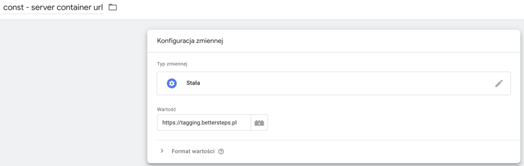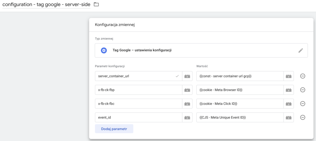 Konfiguracja GA4 server - zmienna konfiguracji GA4 dla łatwego zarządzania zmianami tagowania w przyszłości.